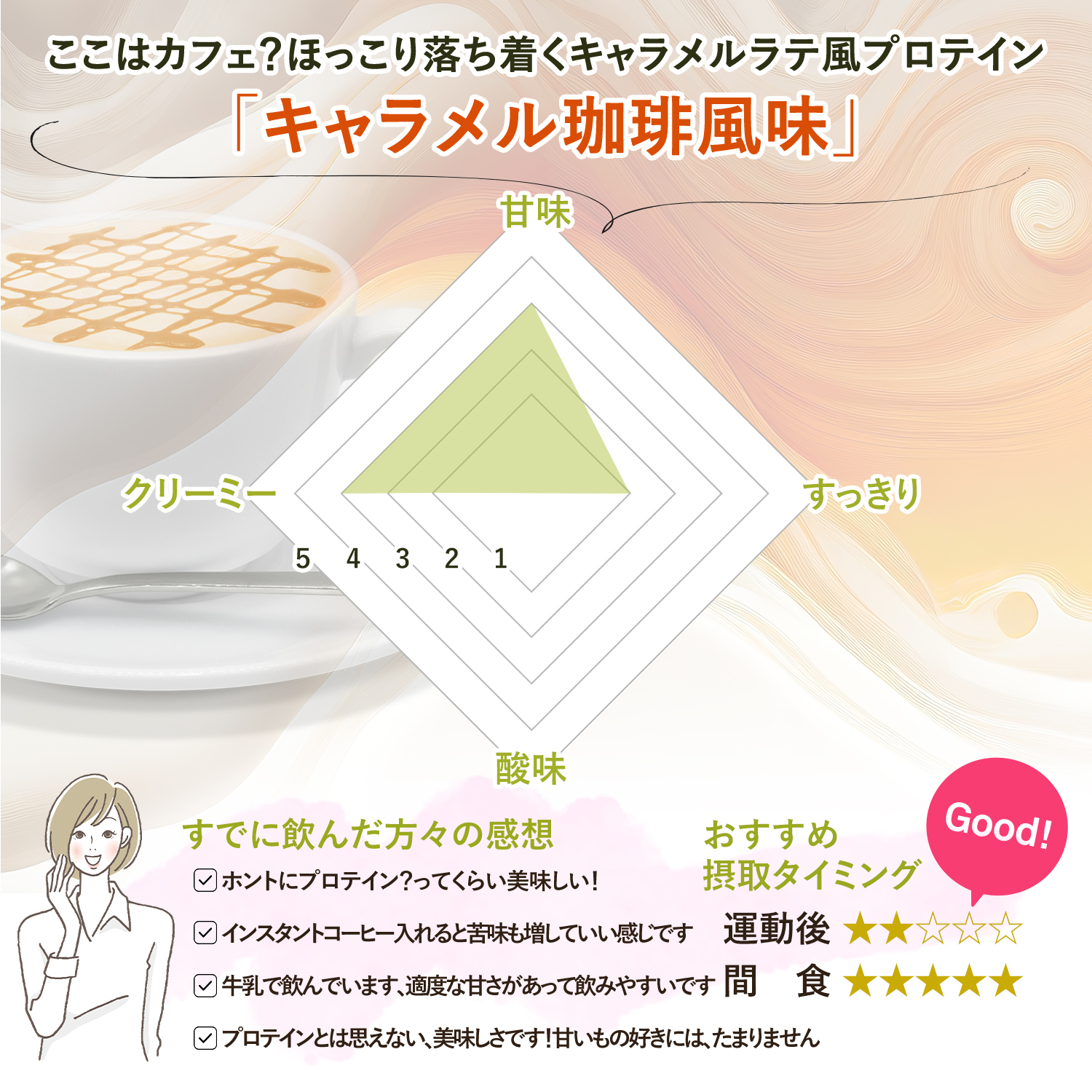 乳清たんぱく(乳成分・大豆を含む)(アメリカ製造)、インスタントコーヒー、キャラメルソース、乾燥酵母/甘味料(ステビア、スクラロース)、ビタミンC、香料、乳化剤、ビタミンB₆ |
