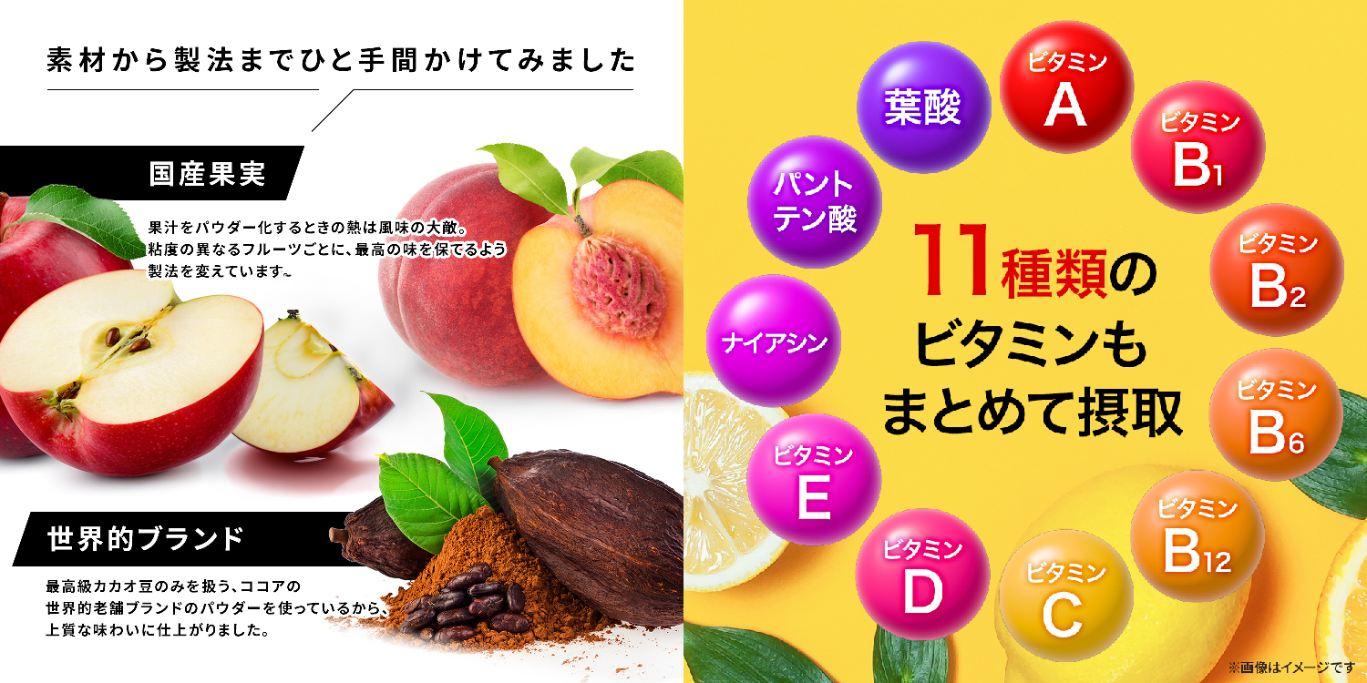 乳清たんぱく(乳成分を含む)(アメリカ製造)、果糖、りんご果汁粉末、食用油脂、さとうきび抽出物粉末/酸味料、香料、クエン酸K、調味料(無機塩)、甘味料(ステビア、スクラロース、アセスルファムK)、ビタミンC、乳化剤(大豆由来)、抽出ビタミンE、増粘剤(グァーガム)、ナイアシン、パントテン酸Ca、ビタミンB1、ビタミンB6、ビタミンB2、ビタミンA、葉酸、ビタミンD、ビタミンB12 |