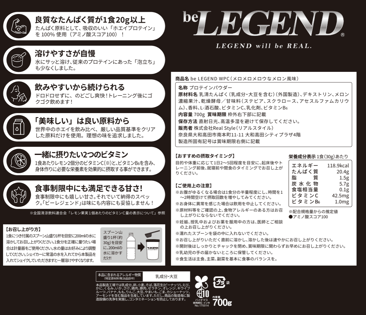 乳清たんぱく(乳成分・大豆を含む)(外国製造)、デキストリン、メロン濃縮果汁、乾燥酵母/甘味料(ステビア、スクラロース、アセスルファムカリウム)、香料、L-酒石酸、ビタミンC、乳化剤、ビタミンB6 |